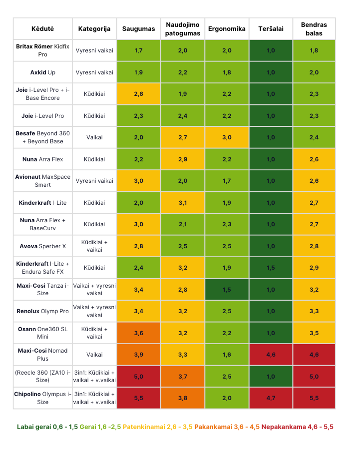 Iš 17-os testuotų autokėdučių, 5 gavo „gerą”, 9 – „patenkinamą”, 3 – „nepakankamą” bendrą įvertinimą. Ir tik 7-ios kėdutės gavo „gerą” įvertinimą iš saugumo dalies.